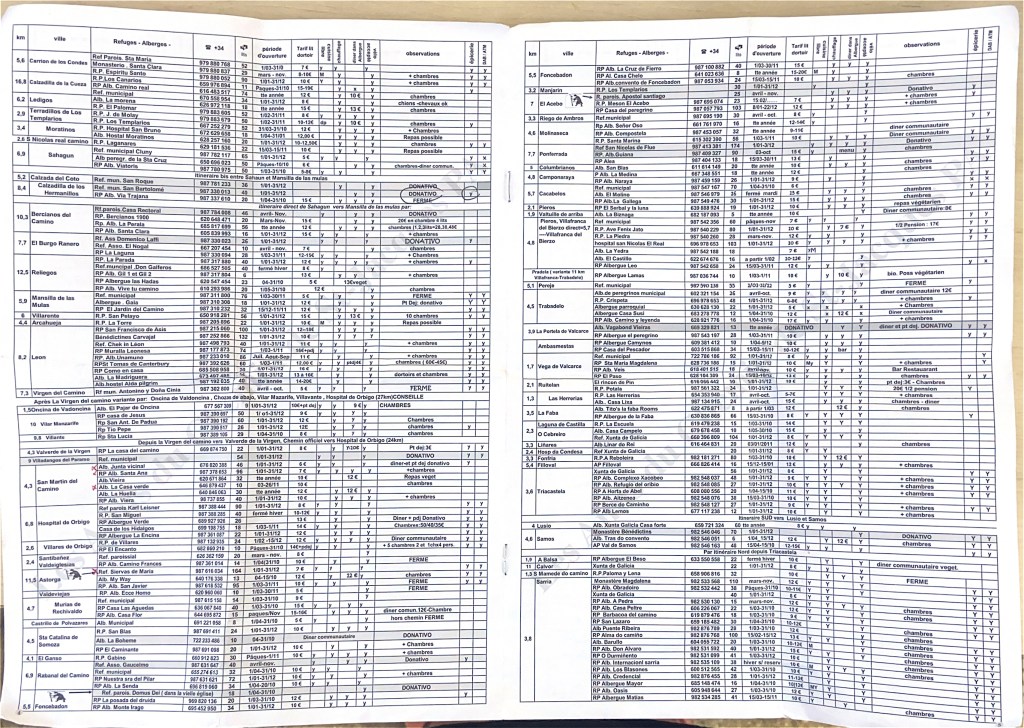 這一份寫的是由一個城市到下一個城市隔著多少公里、城市的名字、那𥚃所有供朝聖者入住的albergue 的名字、電話、可供入住人數、價格(如果漏空了,在Observation 欄會寫著D,則donativo)、還有有沒有早餐、晚餐提供、有沒有廚房或只有微波爐。這張master guide由身兼朝聖之路過來人的義工整理而成,必要資料一目了然,又不重,超級好用。
