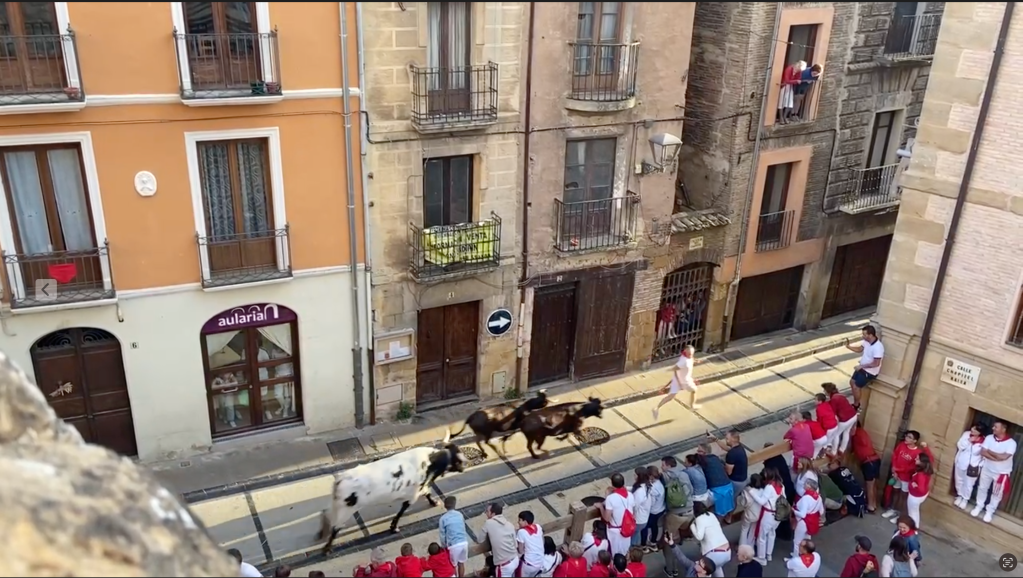 吃完晚餐,找回了S和D同伴,攀上了Iglesia de San Miguel 看奔牛(los encierros)。四隻牛沿著窄行跑,追著另外4個人。當時看我是有給反應,但重看片段,覺得有點不明所以。